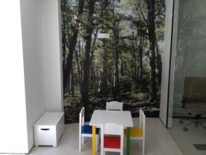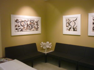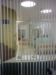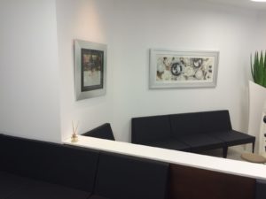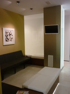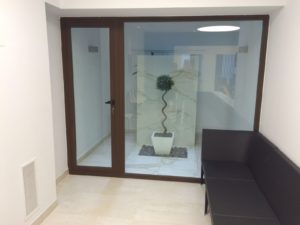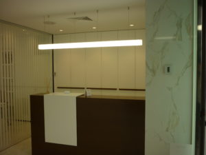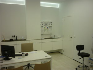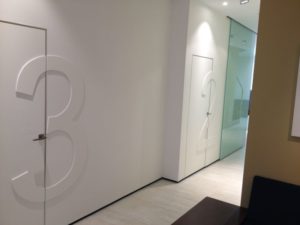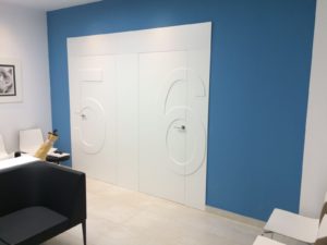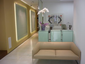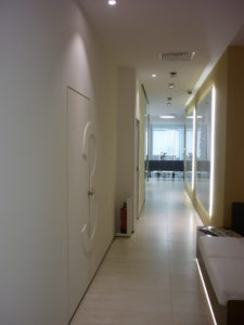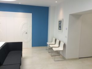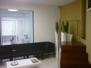 Debido a su actividad los gabinetes son sobrios por lo que el único tono de color lo aporta la sillería y un cristal lacado del mismo tono.