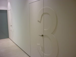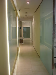 El pasillo es un elemento distribuidor de espacios, por lo que recibe un trato especial. A un lado las puertas de los gabinetes integran la puerta con el número del mismo. En la parte contraria unos paneles de cristal retroilimunado destacan sobre una pared pintada en tono visón.