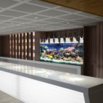 La barra es un elemento distribuidor de trabajo y en este caso también de uso para los clientes, por lo que se construye de forma limpia. La parte inferior es un cristal retroiluminado que ayuda a la iluminación propia del techo.