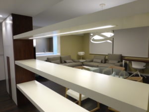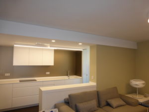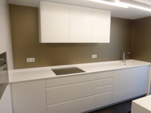 El mobiliario se construye en blanco y la pared se forra con paredes de vidrio lacado. La campana y los electrodomésticos quedan ocultos tras el mobiliario integrándose como un mueble más del salón.