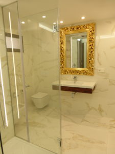 El baño principal contrasta con el estilo minimalista sueco, chapando paredes con mármol de porcelanosa. El verdadero protagonista del baño es el dorado de estilo barroco.