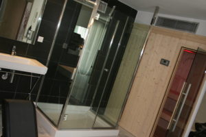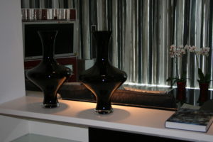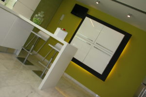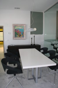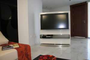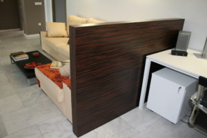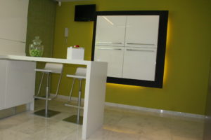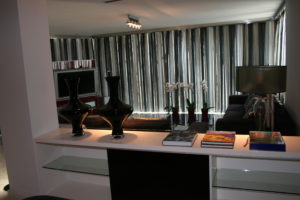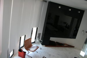 Esto lo conseguimos conjugando una gama de colores beig y paneles de madera. El resto del espacio se combina en blanco y en negro con algunas excepciones cromáticas puntuales .