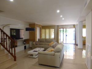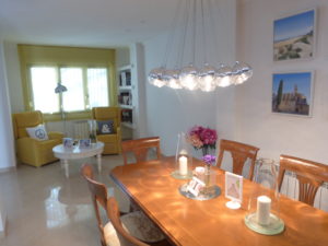La cota del salón-comedor no es única, de esta forma conseguimos que un amplio espacio no quede frio, siempre apoyándonos con mobiliario de colores más atrevidos.