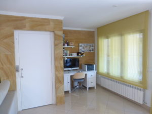 Aquí conjugamos los dos espacios consiguiendo amplitud y luz natural, además de un juego sugerente de trasparencias.