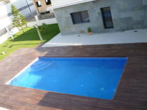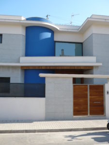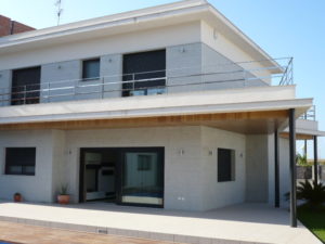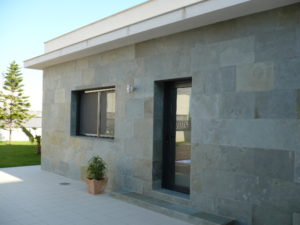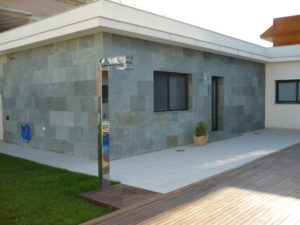 Un muro formado con piezas de pizarra atraviesa toda la vivienda uniendo el exterior con el interior.