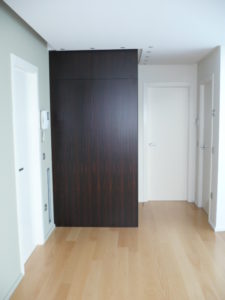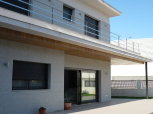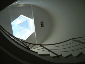 La escalera reducida a la mínima expresión con formas sobrias, combinando acero y madera de nogal, une todas las plantas de forma rotunda, apoyada por un cristal de grandes dimensiones que trascurre por todas las plantas y las dota de luz natural.